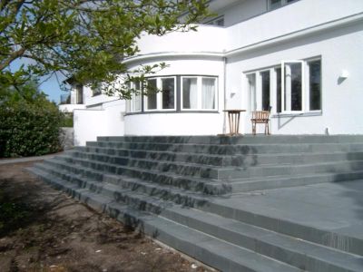 Terassenanlage mit ca. 100 m² Fläche sowie ca. 35 m² Treppenstufen in grünem Schiefer 60 x 60 cm Platten
